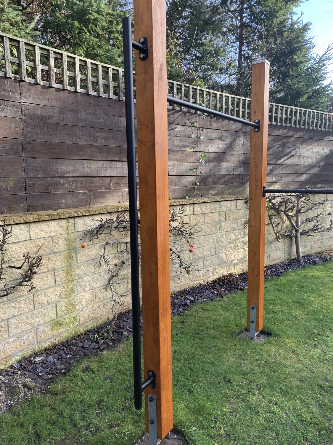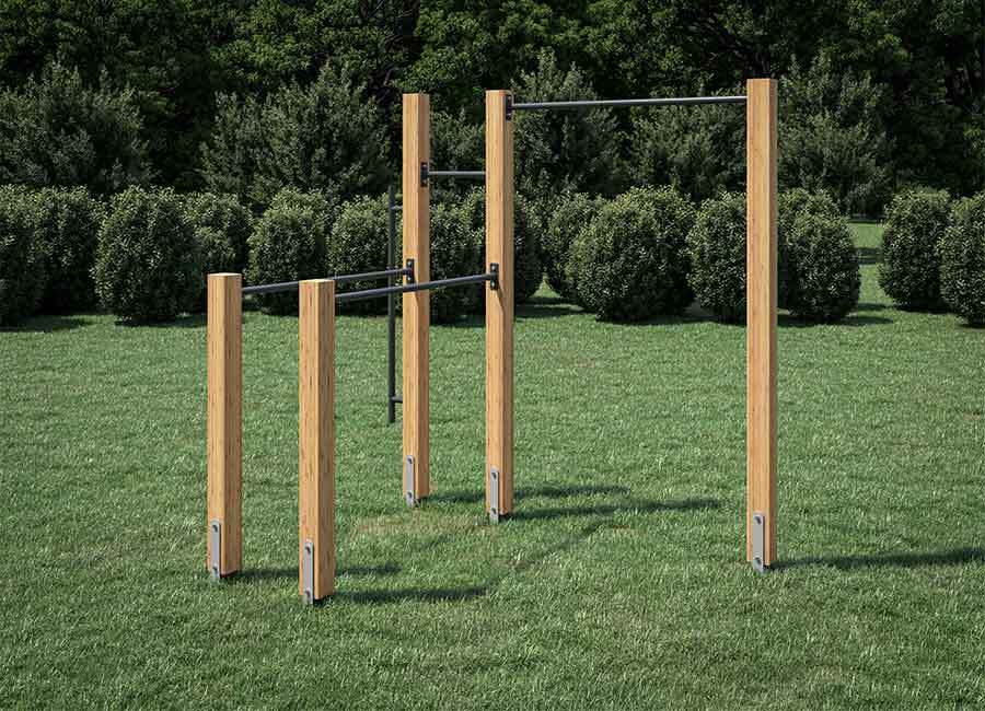 This installation has a small footprint but offers a high degree of functionality. In addition to high bar training, the parallel bars enable you to work on planche, L/V sit and dip training. The bar between the parallel bars enables decline press ups. The human flag bar can be positioned to suit the space available.