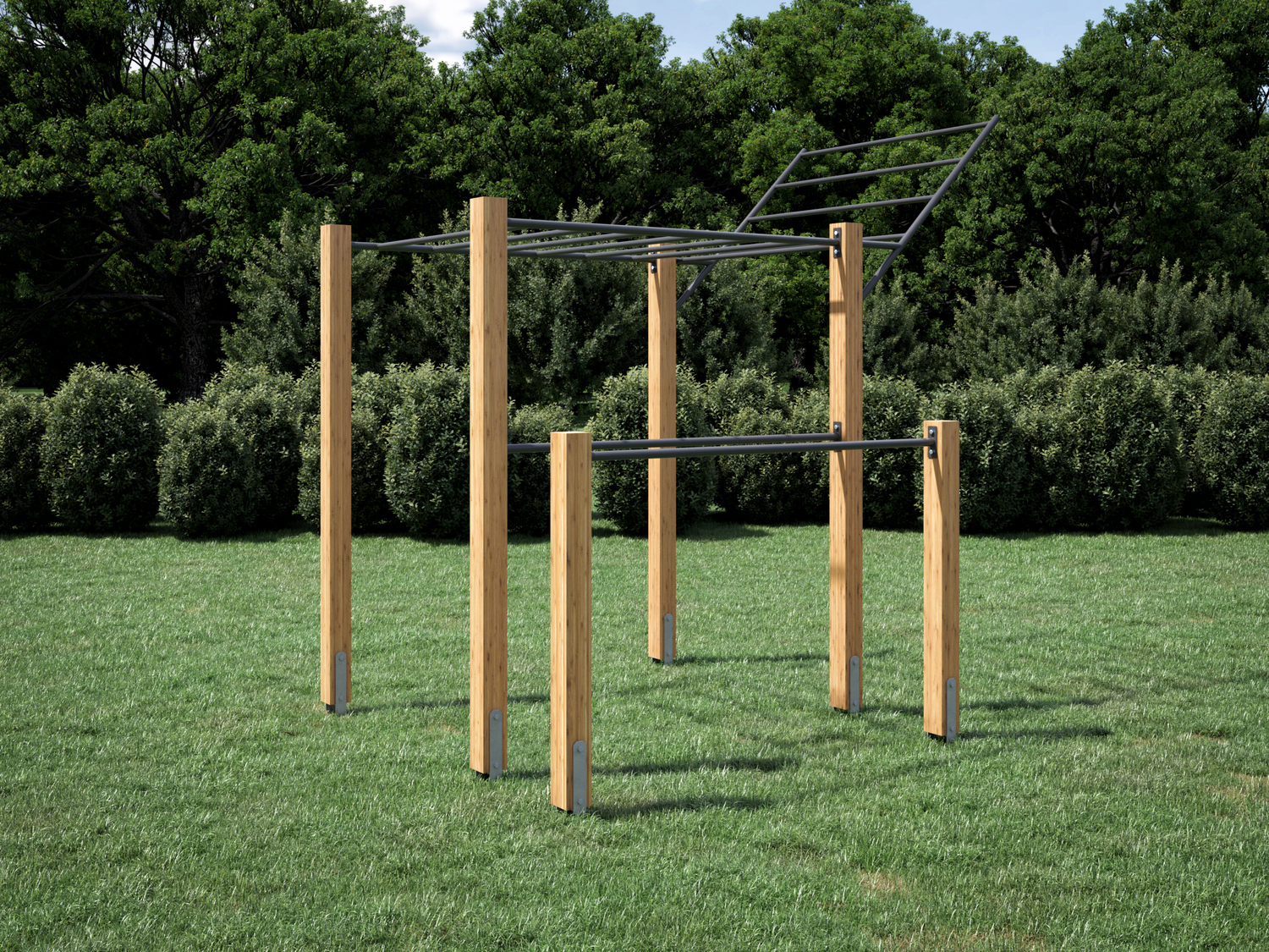 At 1500mm wide, and 2000mm long, the monkey bars are generously proportioned, giving room for several users. The wing bar is also 1500mm wide and the top rung gives an extra 1000mm of height which is ideal for ring training or mounting a climbing rope.
