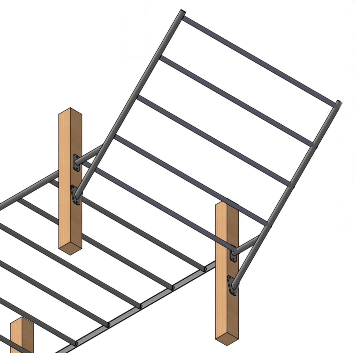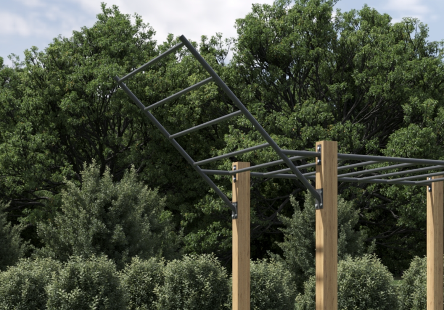 The sides are constructed from 44mm S355 steel and the rungs are made from 33.7mm S355 steel. There are 5 rungs in total, with 333mm spacing. When installed with the monkey bar ladder, the bottom rung is in line with those of the monkey bar, allowing for continuous uninterrupted movement along and up the wing bar.